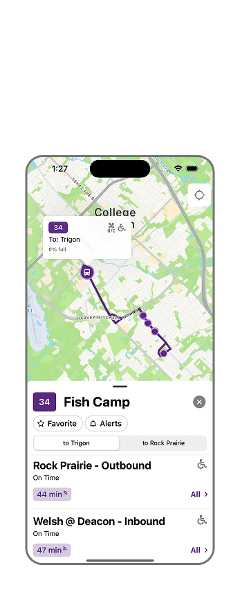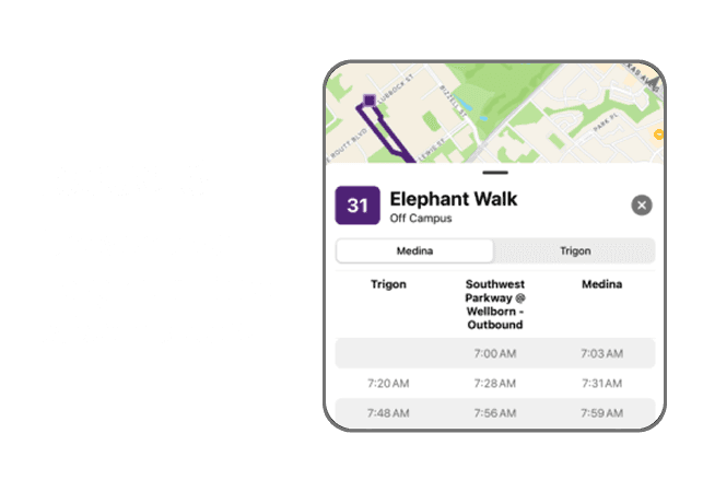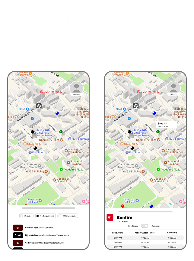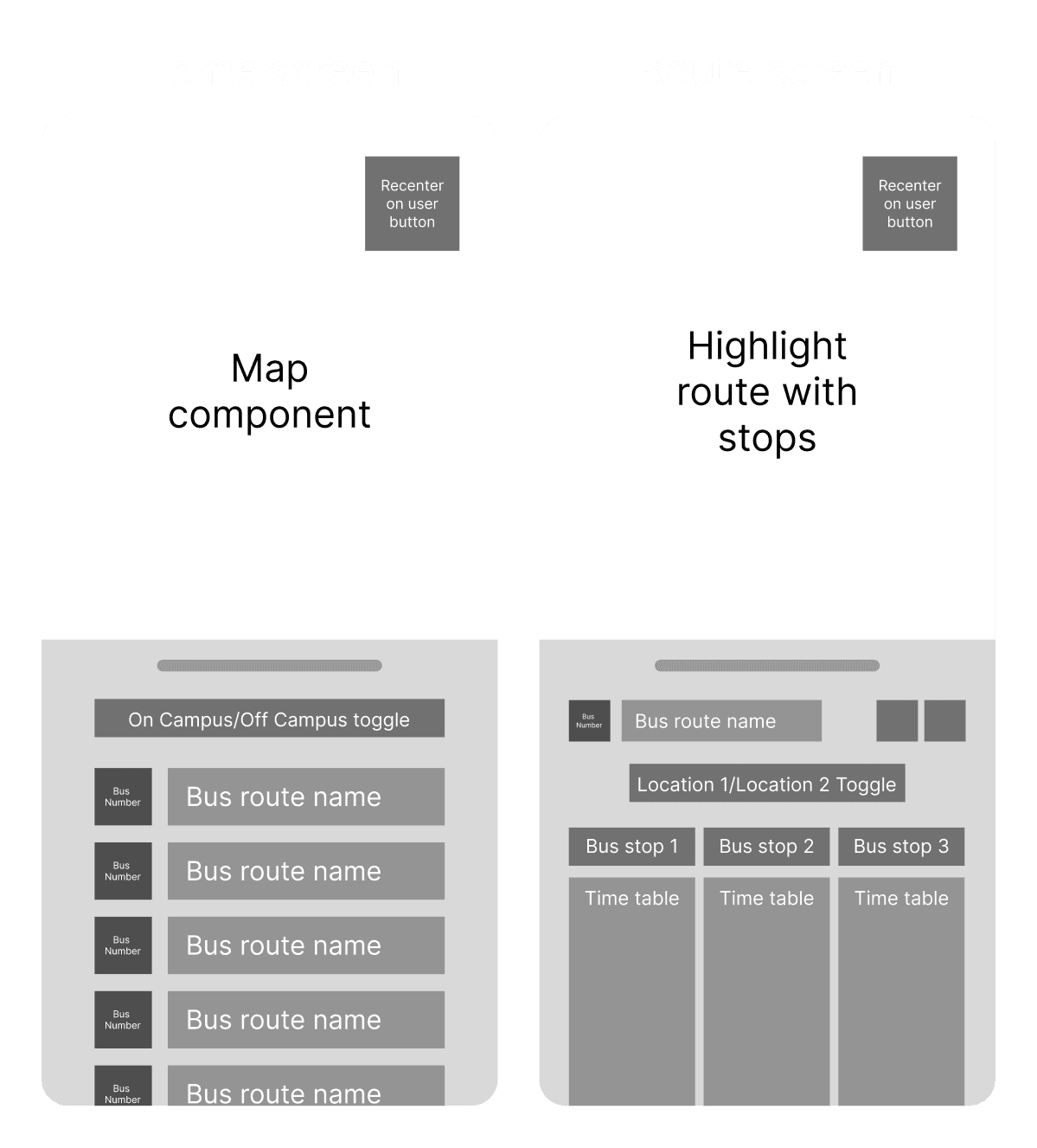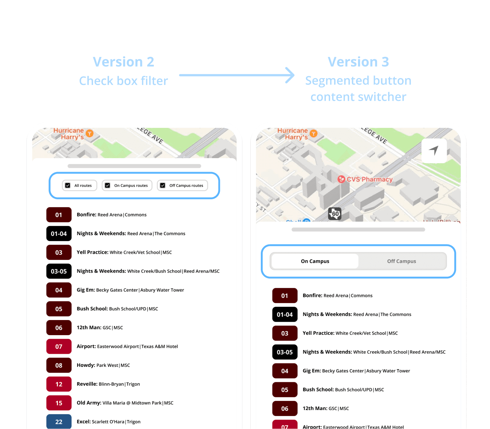 Switching to a drawer limited header space for navigating “On-Campus,” “Off-Campus,” or “All Routes.” I first tried a checkbox filter, but after discussing with a developer, we realized “All Routes” was unnecessary.
