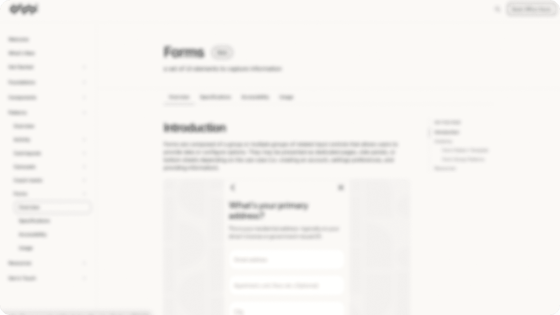 (Blurred for company privacy) documented Form best practices (accessibility, usage guidance, anatomy, etc.) for designer and building specs for engineers on the company design system site.